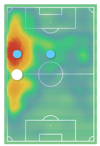 The below heat maps of Anderson (left) & Snodgrass (right) show that our wingers have to do a lot of covering for the full backs. Additionally, it must be noted that those playing in the left channel spend most of their time in the middle third of the pitch rather than the final part where they offer the most threat.